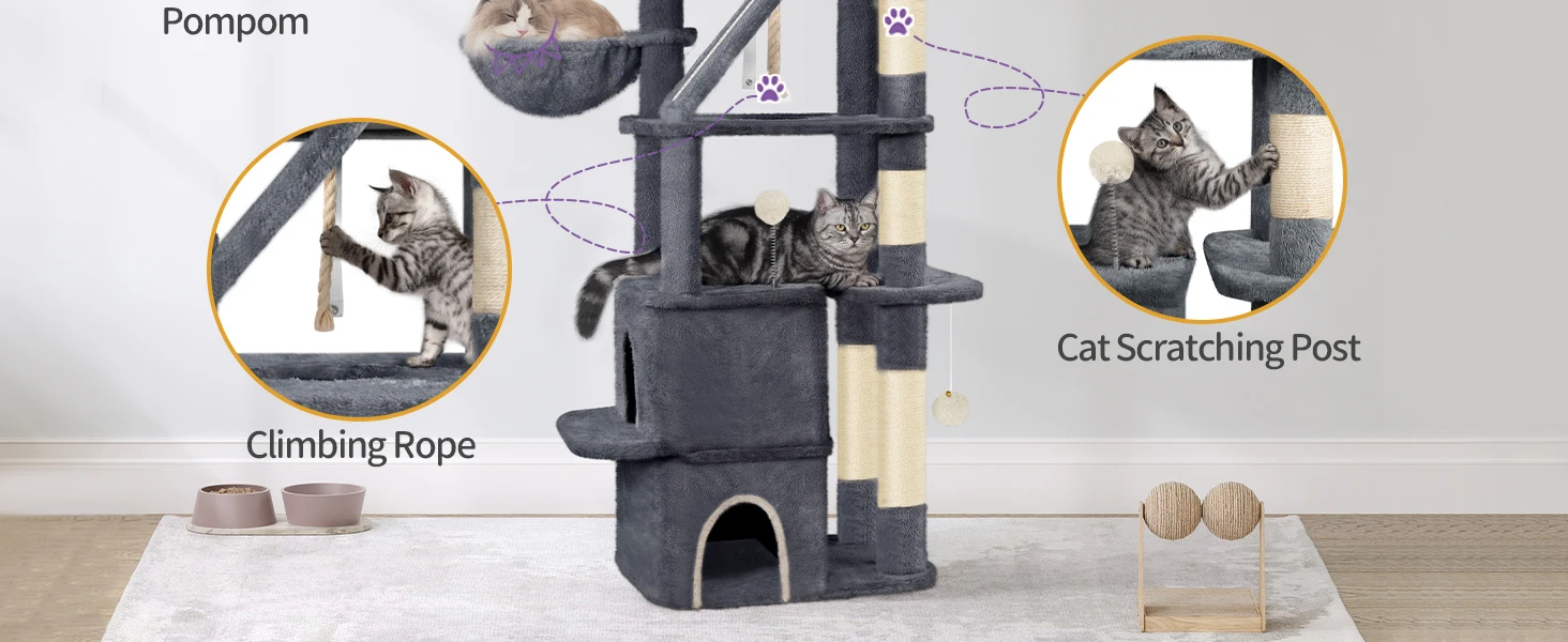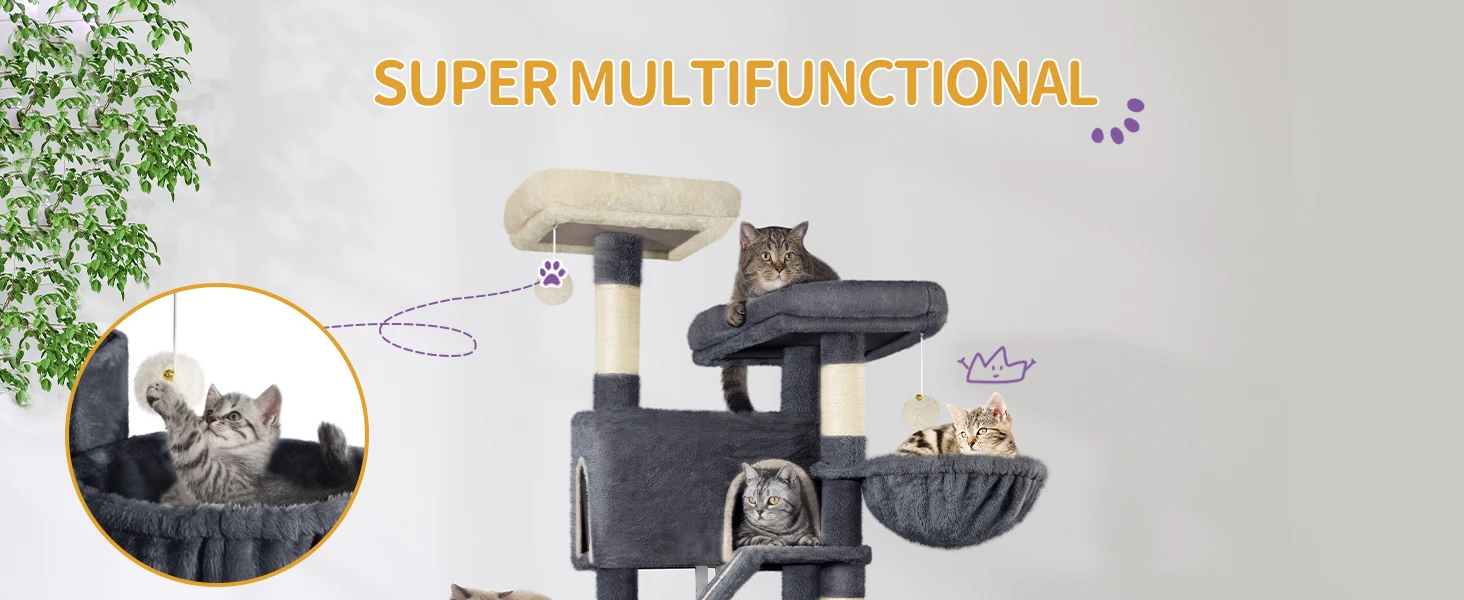 Multifuncional: Incluye 2 plataformas, 3 cuevas, 2 cestas, 3 pompones, 1 pelota con resorte, 1 escalera rascadora de sisal y 1 cuerda para trepar. Incluso varios gatos pueden encontrar su propio espacio para jugar juntos.