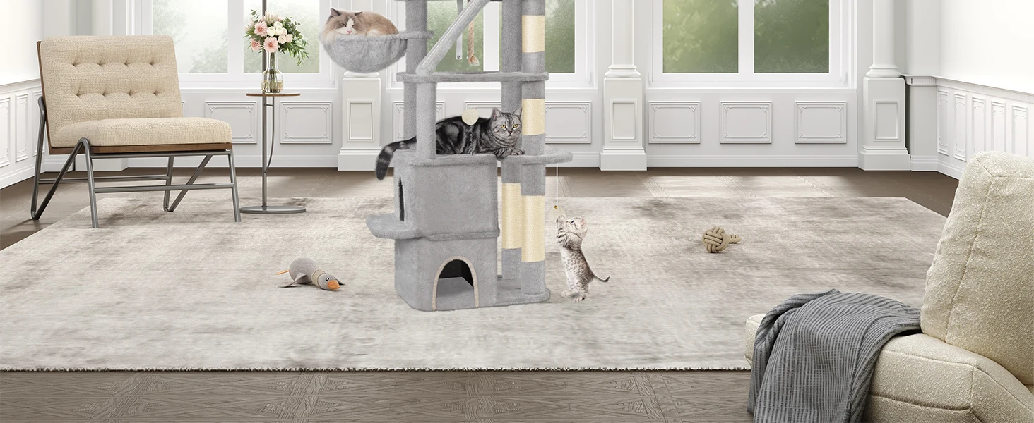 Ahorra espacio: Su diseño vertical de varios niveles ocupa poco espacio para que los gatos se diviertan sin límites. La base de madera reforzada y el kit antivuelco garantizan la estabilidad.