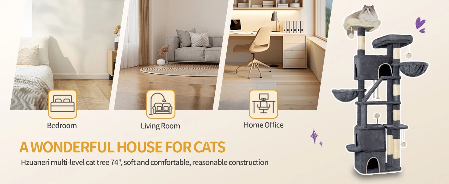 Árbol para gatos Hzuaneri de 185 cm, torre grande para gatos de interior, mueble para casa de gatos con 2 plataformas, 3 casitas y 6 postes rascadores.