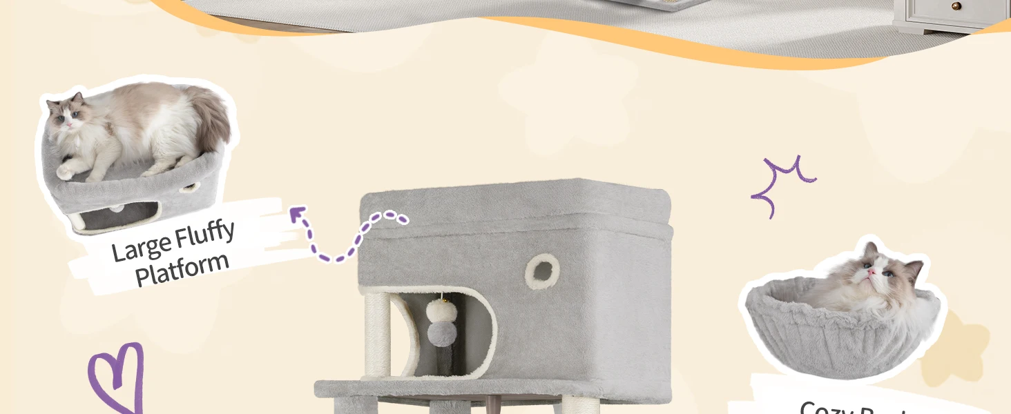[Doble cueva, mirador extragrande] El mirador extragrande en la parte superior ofrece a tu mascota espacio suficiente para estirarse. Dos cuevas grandes (55 x 45 cm y 55 x 30 cm) permiten que tu gato juegue y descanse cómodamente.