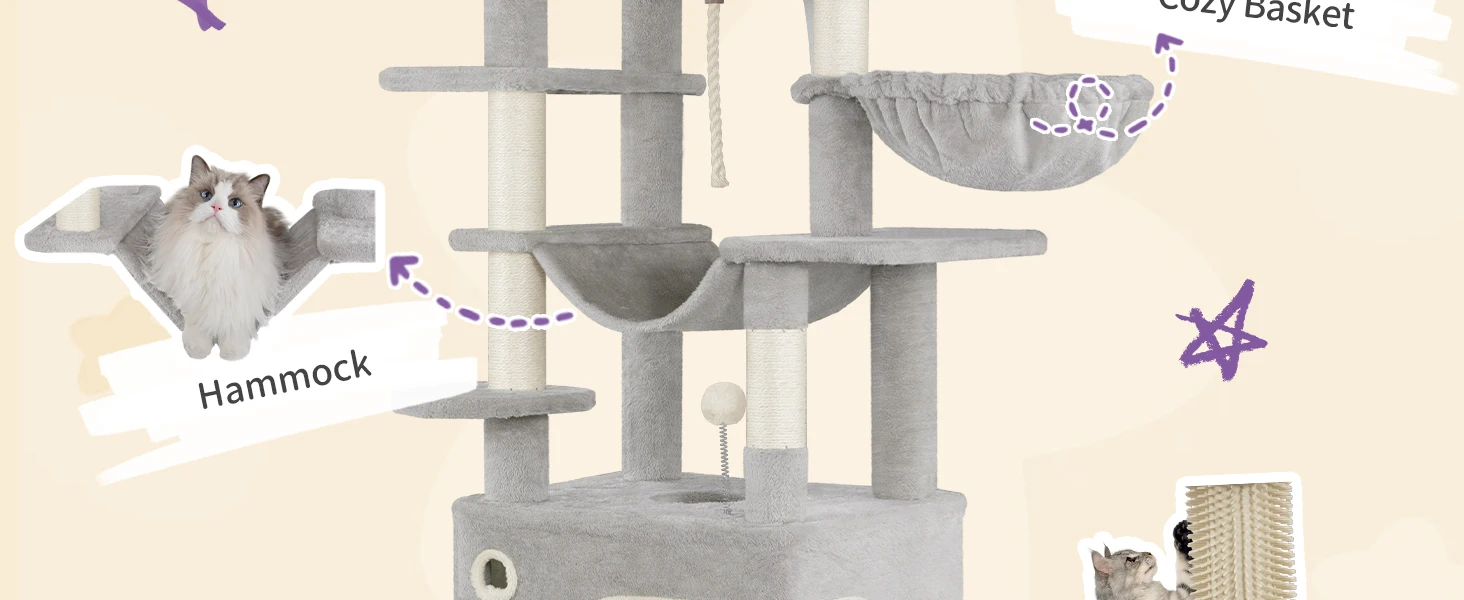 Un conjunto de opciones de juego garantiza diversión sin fin: 1 plataforma de observación grande, 2 guaridas para descansar, 1 cesta colgante que a los gatos les encanta y 1 hamaca mullida para las siestas. Ya sea para jugar al escondite o a agarrar objetos, este árbol para gatos es la mejor opción.