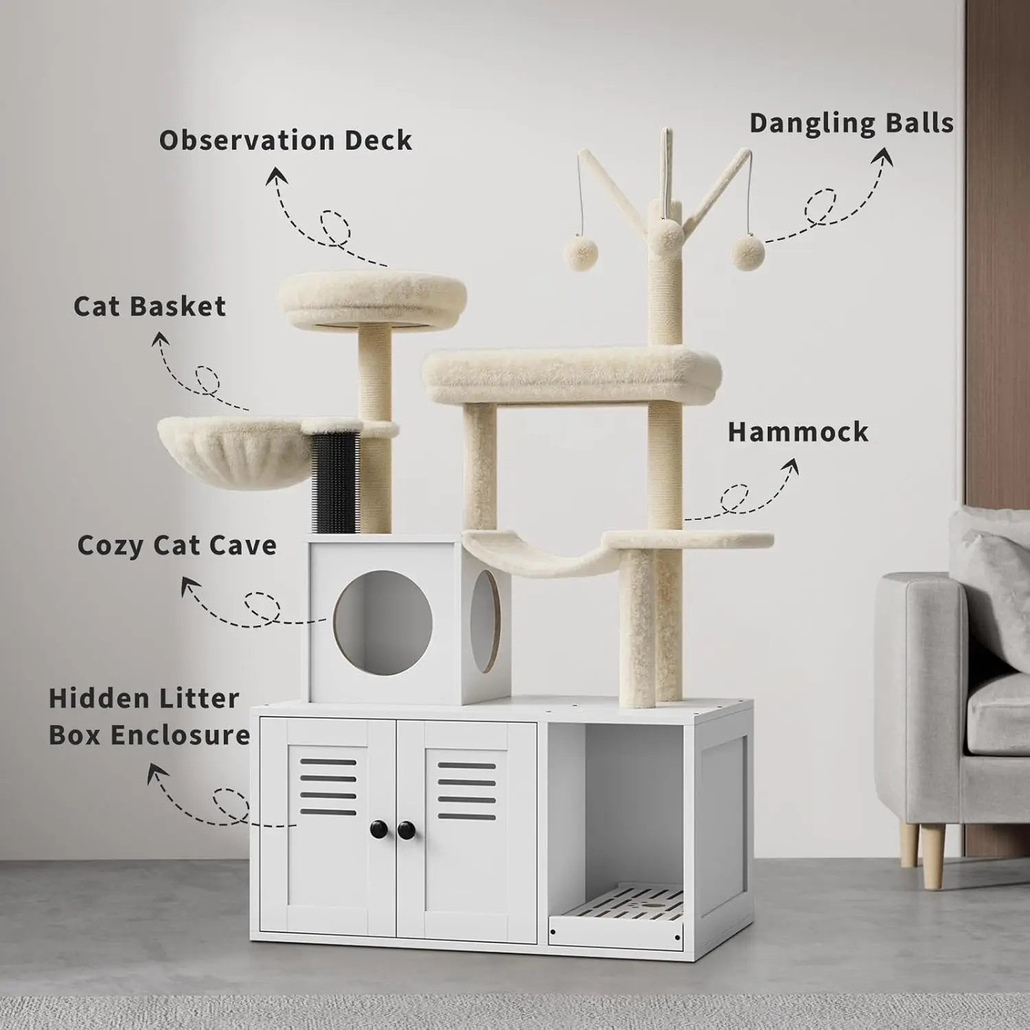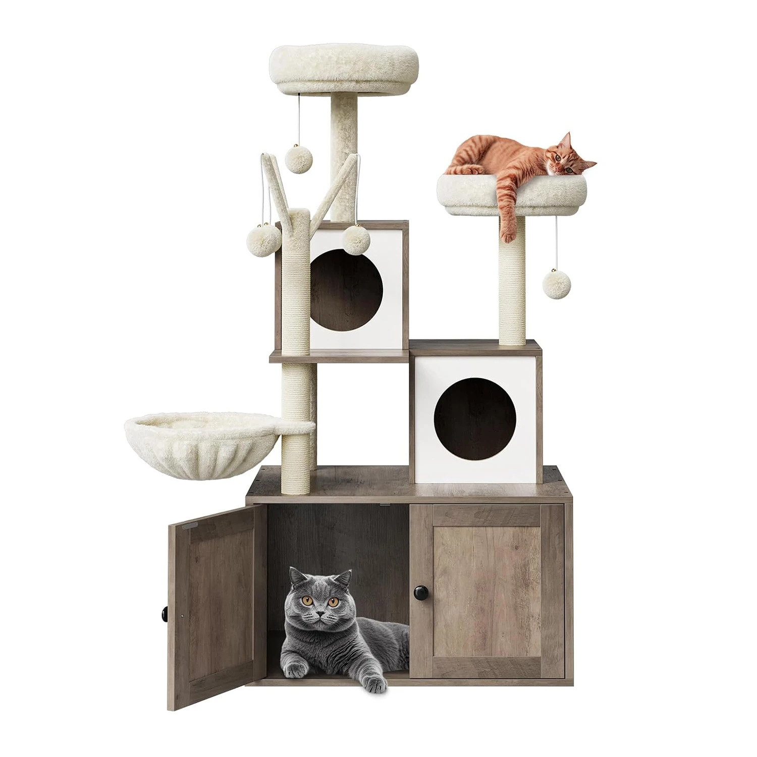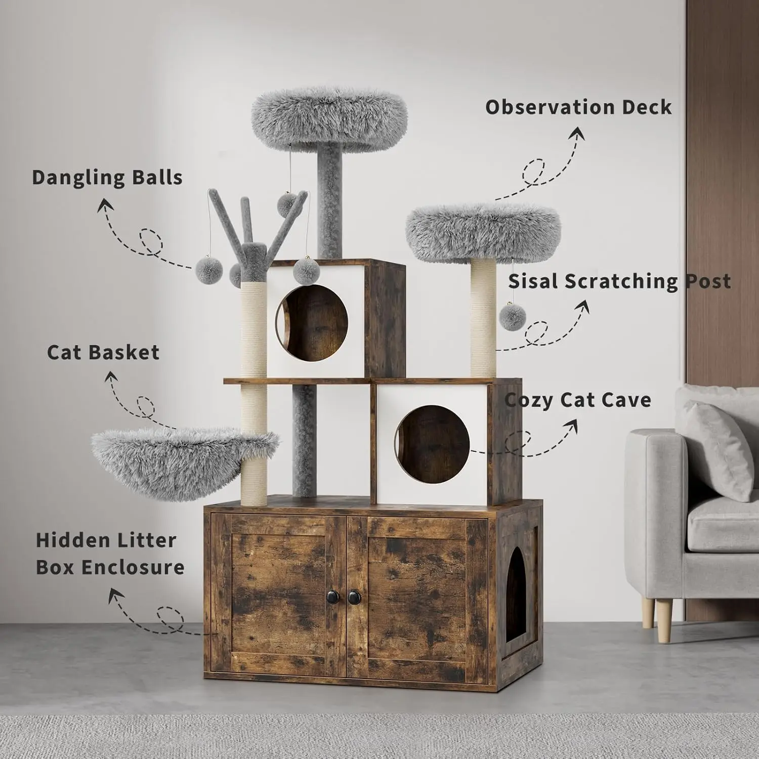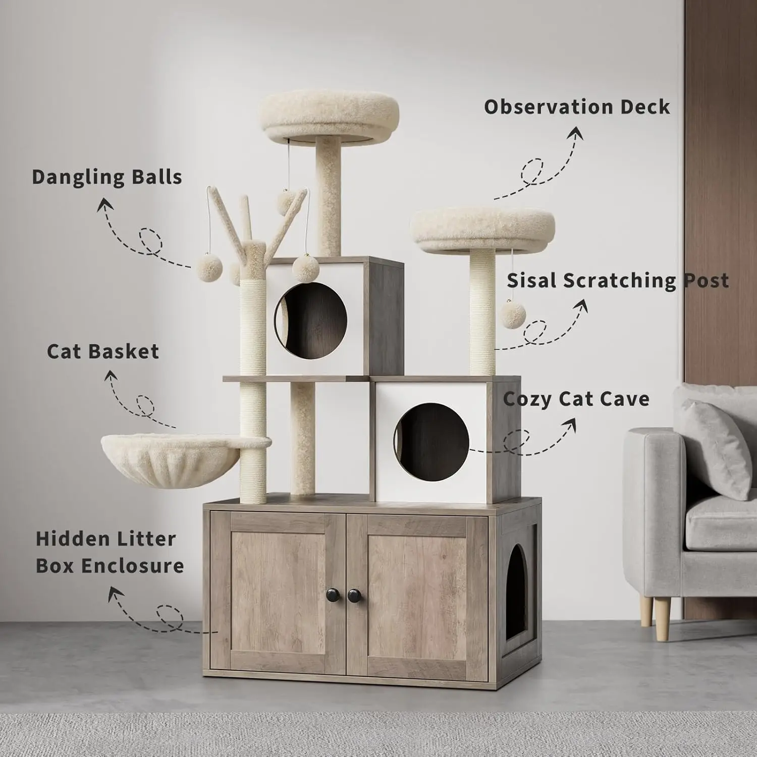 Caja de arena con rascador y casita para gatos, mueble con arenero oculto, poste rascador de sisal y percha de felpa suave, mueble de madera para gatos con múltiples plataformas