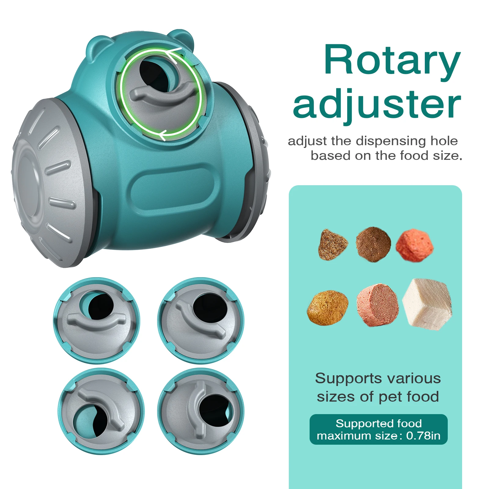 El juguete cuenta con un interruptor dispensador de premios, adecuado para diferentes tamaños y especificaciones de alimento seco, cecina o galletas. El interruptor se puede ajustar según el tipo de alimento, lo que permite controlar la cantidad de alimento y aumentar o disminuir el tiempo que tardan las mascotas en obtenerlo.